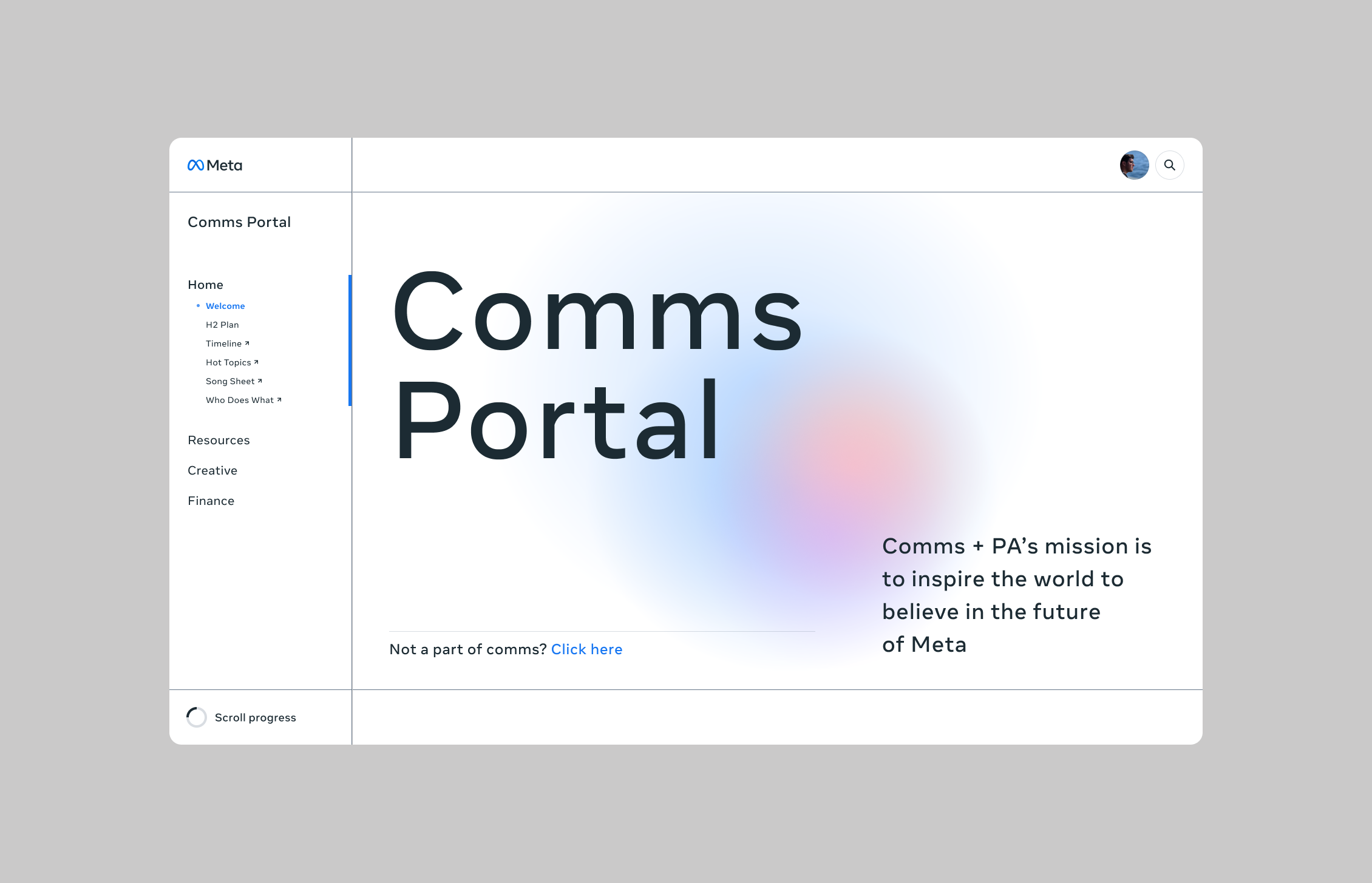 The Comms Portal is Meta’s central hub for Communications and Public Affairs, and was created to address the lack of a centralized, secure space for resources, which previously led to scattered documentation and inconsistent access. Developed as a bottom-up initiative to streamline communications infrastructure, it leverages a scalable framework of bespoke components, enabling rapid page creation while minimizing reliance on external visual assets.